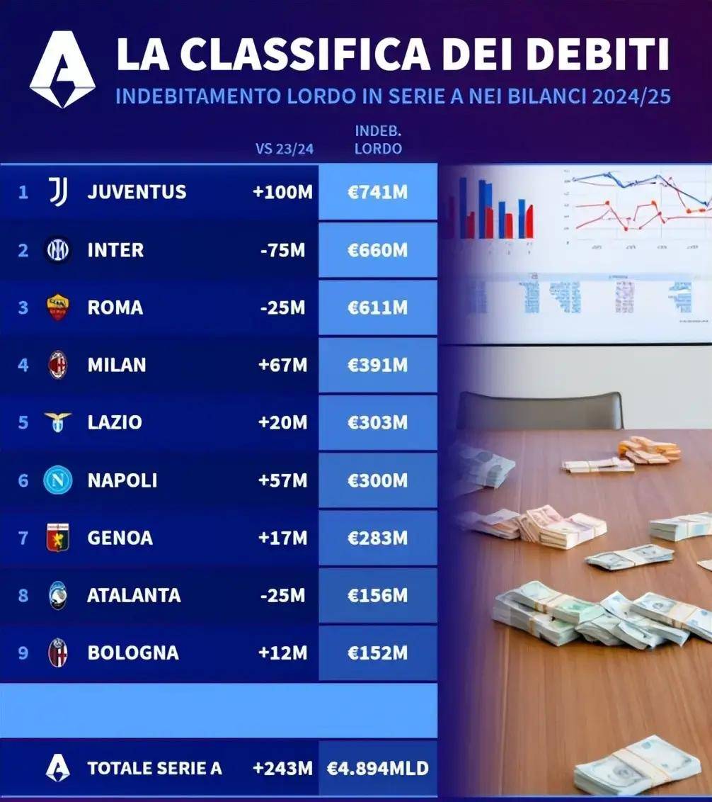 意大利足球的日子好像还没平静下来,意甲联赛整体财务状况已经很糟糕了。最新数据显示,到2025年,意甲20家俱乐部总共欠了48.9亿欧元,这数字可吓人了,比上一赛季的47.2亿欧元还多。这不仅说明联赛内部运营有危机,也让人感觉到债务问题对意甲的影响越来越大,意甲要稳定发展,路更不好走了。